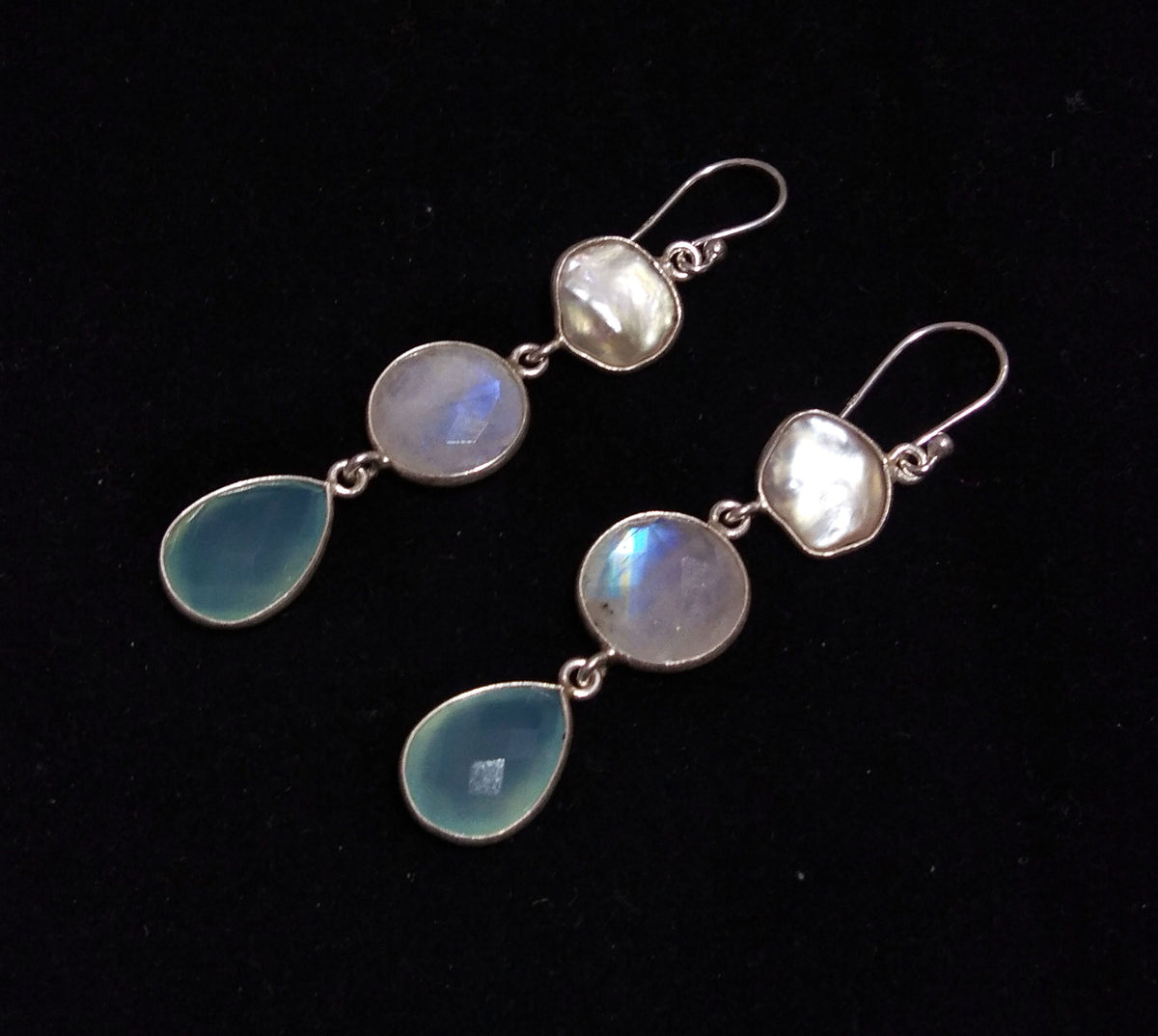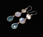 Nice Quality Natural Fresh Water Baroque Pearl/Rainbow Moonstone/Aqua Chalcedony Stone Drop Earring 925 Solid Starling Silver Earring Pearl/Moonstone/Chalcedony Gemstone Size...