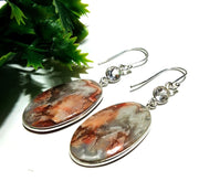 These earrings are made with 925 sterling silver, natural white zircon gemstones, and picture jasper stones, all carefully handcrafted for quality and beauty.