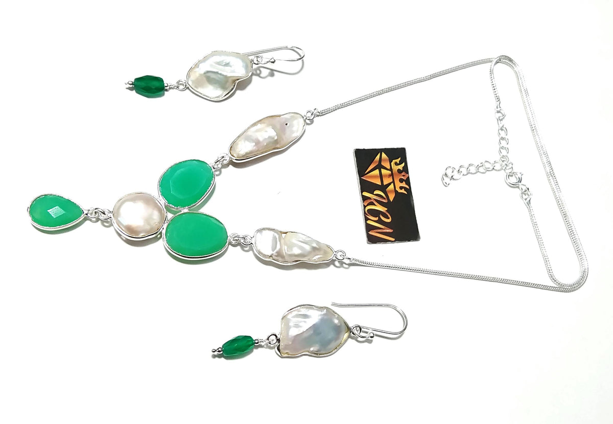Natural Fresh Water Pearl/Chrysoprase Stone Necklace Earring Jewelry Set, 925 Sterling Silver Necklace Jewelry, Necklace Set For Women