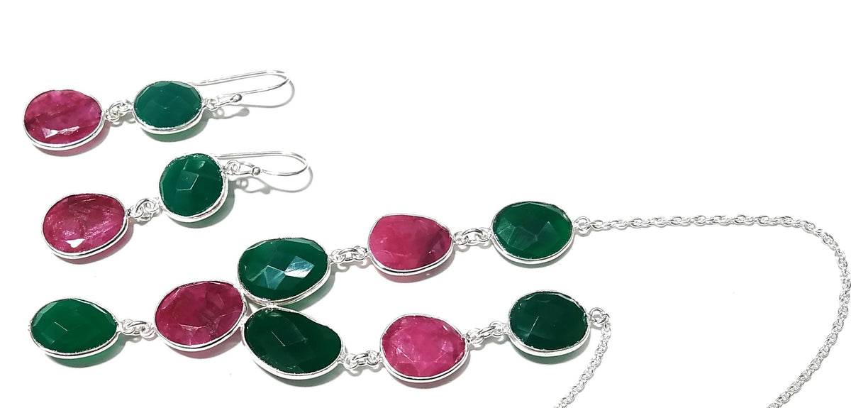 Natural Green Onyx & Red Ruby Necklace and Earring Jewelry Set, 925 Sterling Silver Necklace Earring Jewelry, Gift For Women Birthstone